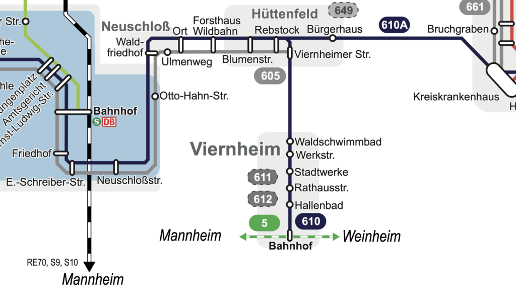 Mit dem 610A entsteht zugleich für die Kernstadt und Neuschloß eine direkte Anbindung an das Kreiskrankenhaus und auch an den Bahnhof Heppenheim. Die bisherige Linie 664A von Hüttenfeld nach Heppenheim kann entfallen.
